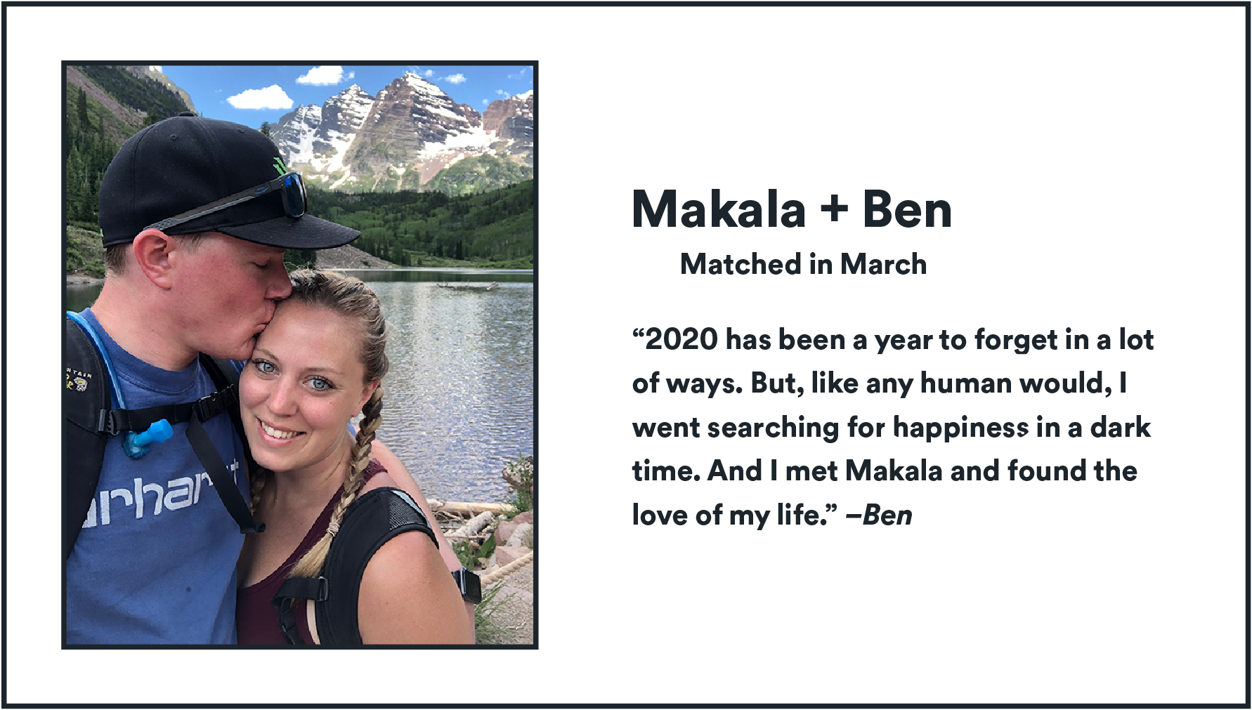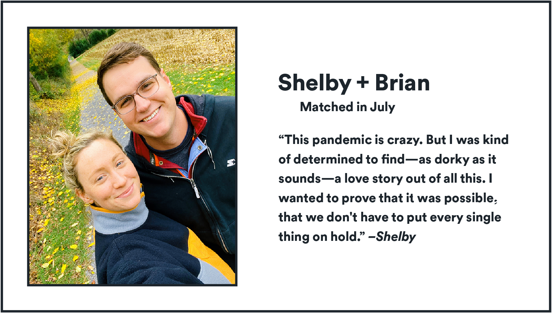 For some, COVID’s forced relocations — to parents’ homes, out of cities — led to serendipitous matches as Bumblers swiped in new areas. “Shelby and I can say that if not for the pandemic and Bumble we would have not met,” says Marta, whose story can also be seen here. “He was living in Colorado and I was in NYC, but both of us relocated to Florida to be with family, staying for longer than anticipated. And the rest is history.” Meet these couples, get to know their stories, and feel hope for love in 2021.